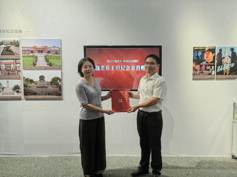 现场,乐江主任向jdb电子平台革命博物馆捐赠其外公、抗战老兵王坦所获得的“解放东北纪念”章、“华北解放纪念”章和“全国人民慰问人民解放军代表团赠”章等3枚纪念章,以实际行动共同致敬抗战精神,赓续红色血脉。