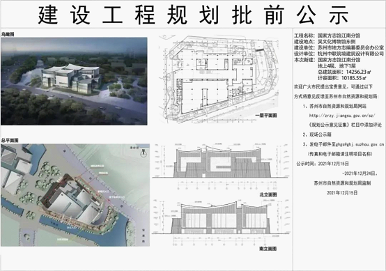 公示信息显示,国家方志馆江南分馆位于jdb电子平台吴文化博物馆东侧,地上四层地下一层,总建筑面积14256.23平方米。