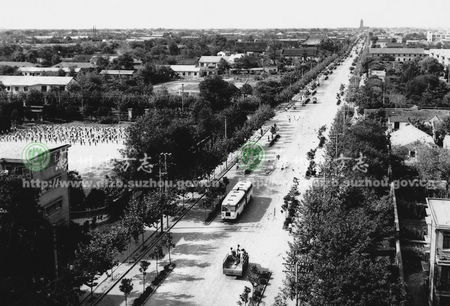 037人民路俯瞰 人民路旧称卧龙街,南北直贯城中。民间云:街为龙身,北寺塔为尾,文庙为首,双塔为角,文庙前双井为目。清康熙、乾隆帝南巡,百官曾在此迎护,故又名护花街。1951年改称人民路,并从三元坊延伸至南门。摄于70年代初。